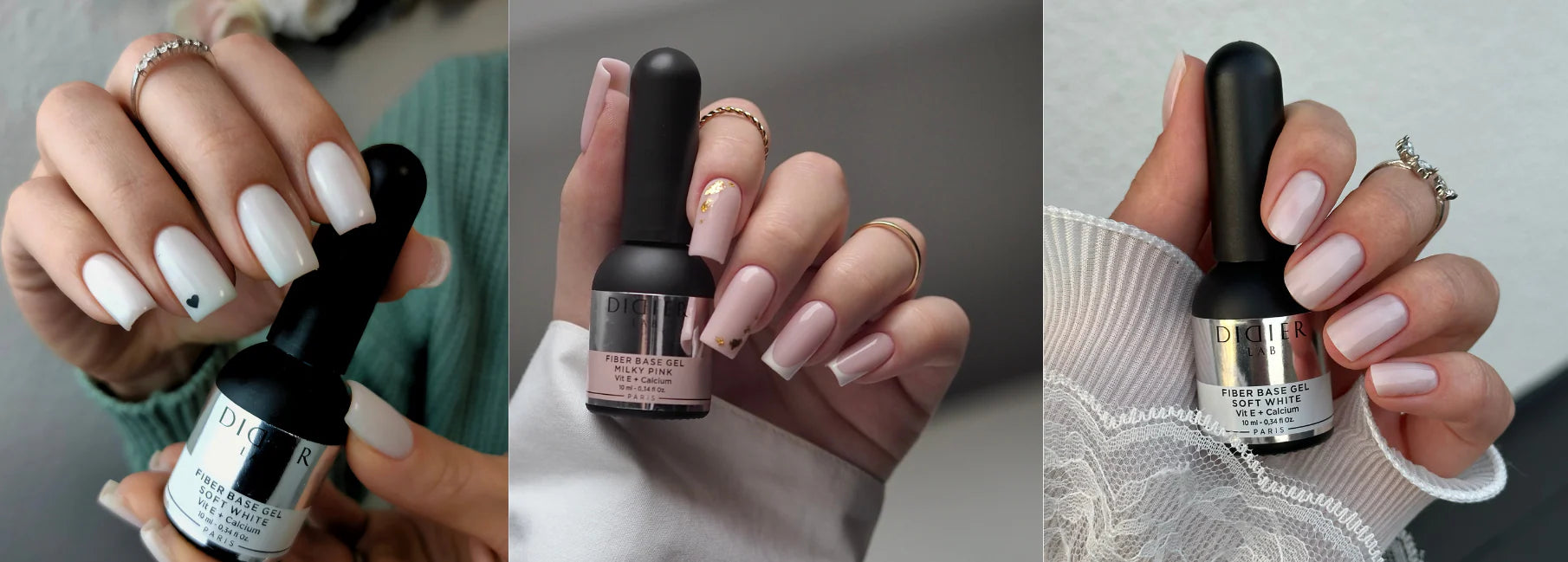 Milky Pink, Octagon, Strong Fiber, Glass, Nude, Shimmer Nude, Shimmer White, Soft White, Neutral.
