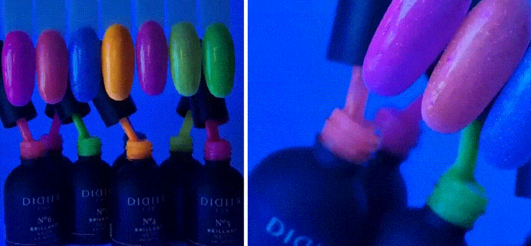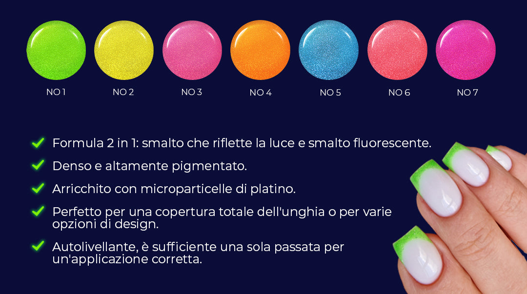 - Uno smalto con 2 effetti: smalto che riflette la luce e smalto con effetto neon.