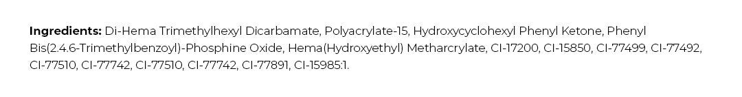 Di-Hema Trimetilesil Dicarbammato, Poliacrilato-15, Idrossicicloesil Fenilchetone, Fenilbis(2,4,6-trimetilbenzoil) ossido di fosfina, 2-idrossietil metacrilato, CI-17200, CI-15850, CI-77499, CI-77492, CI-77510, CI-77742, CI-77510, CI-77742, CI-77891, CI-15985:1